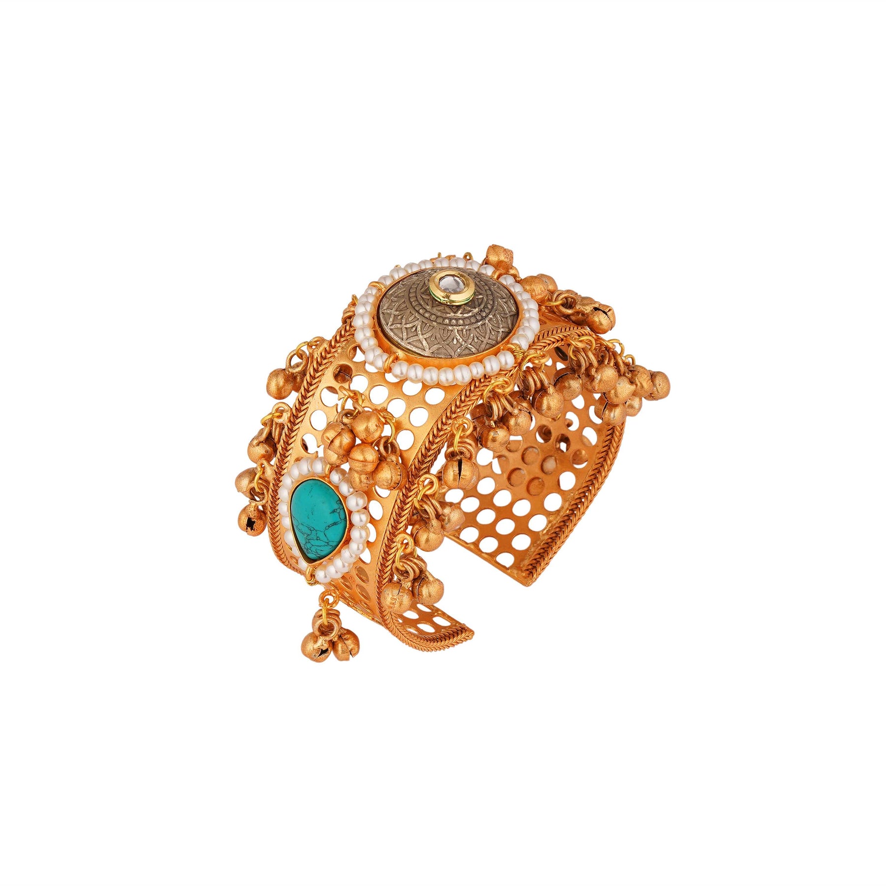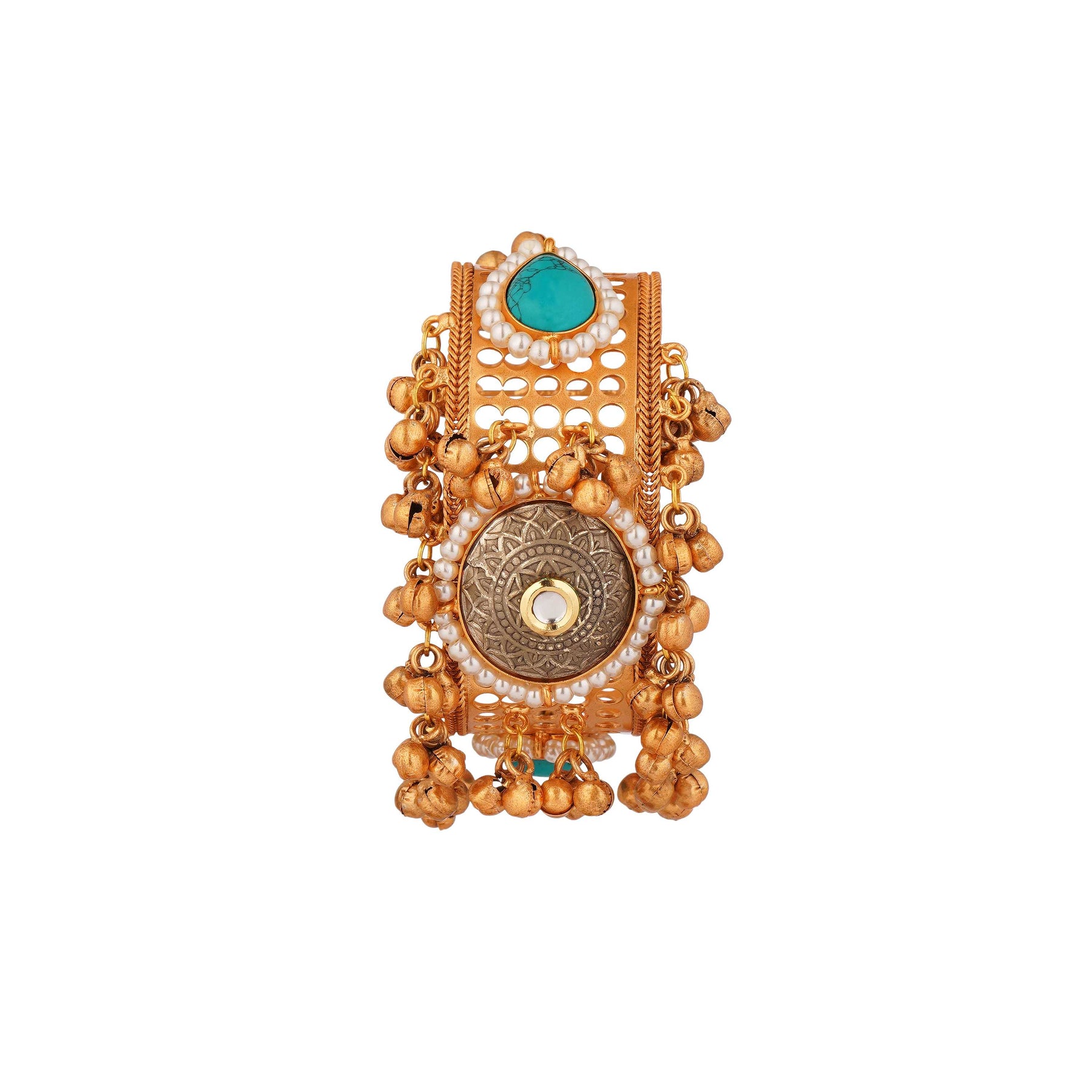 A bold antique-style kada bracelet designed with a detailed round centerpiece, pearl accents, and ghungroo hangings. The touch of turquoise stone adds a unique charm. Perfect for weddings, festive looks, and traditional outfits, this kada makes a strong fashion statement.