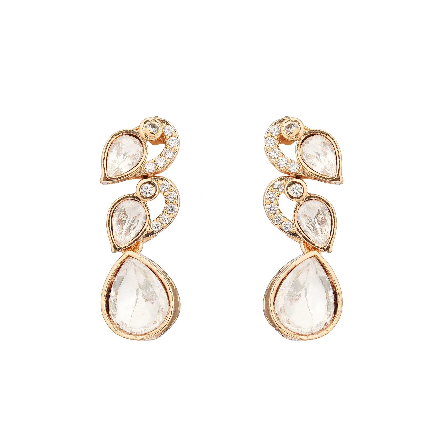 Jewellery Set: A stunning necklace set featuring AAA+ CZ stones in teardrop and floral motifs, arranged in a graceful cascading design. Set in a glossy gold finish, the necklace comes with a matching pair of elegant drop earrings. Lightweight yet eye-catching, this set exudes timeless charm and modern sophistication.