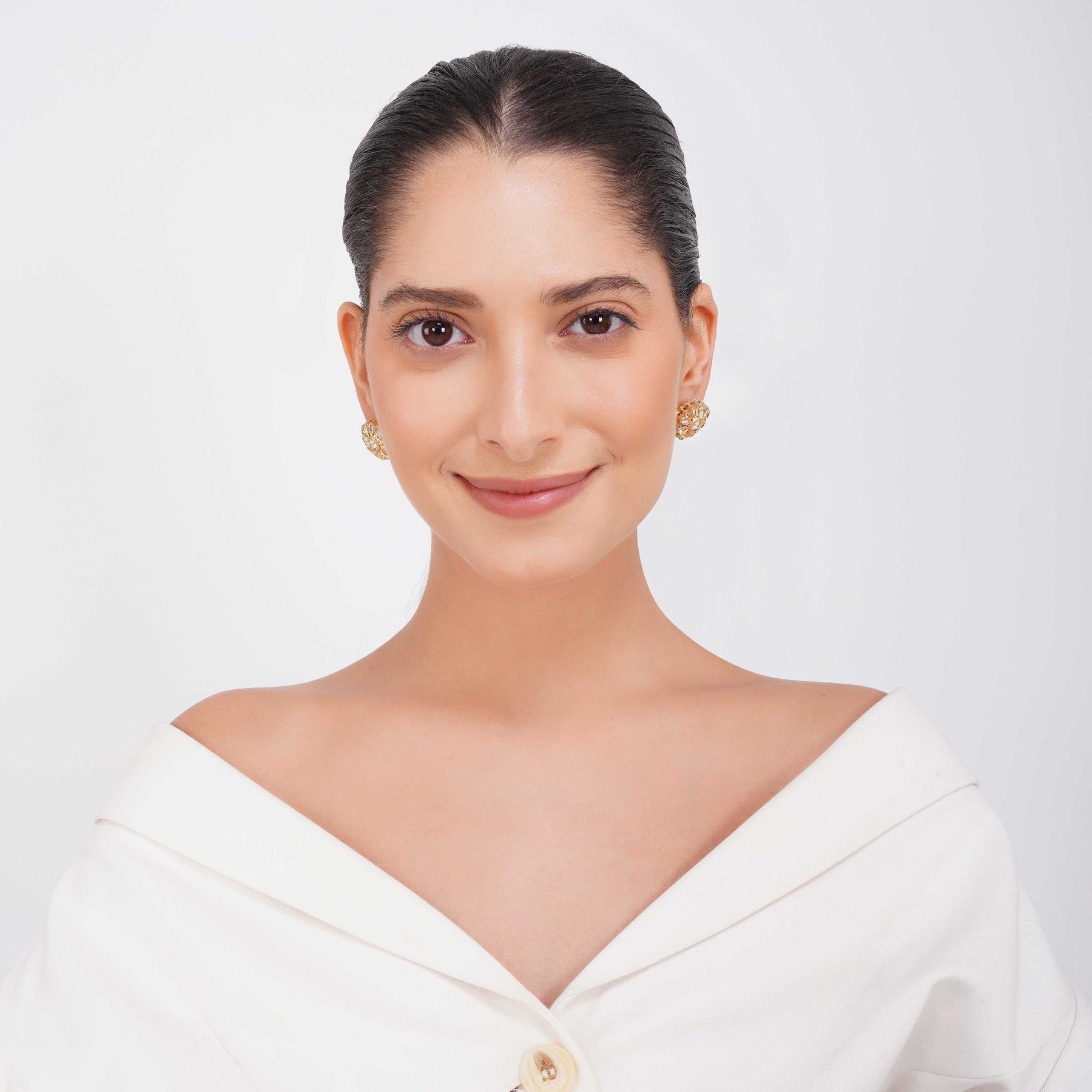 Jewellery Set : A graceful stud earring crafted in a floral design, featuring sparkling AAA+ CZ stones set in a rich gold finish. Its intricate craftsmanship and timeless charm make it a perfect blend of elegance and sophistication.