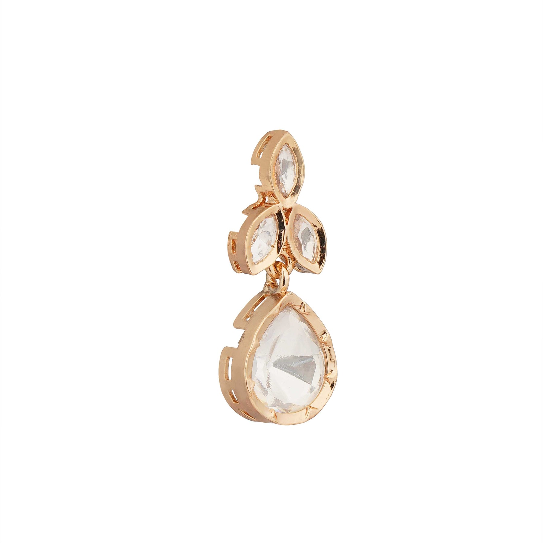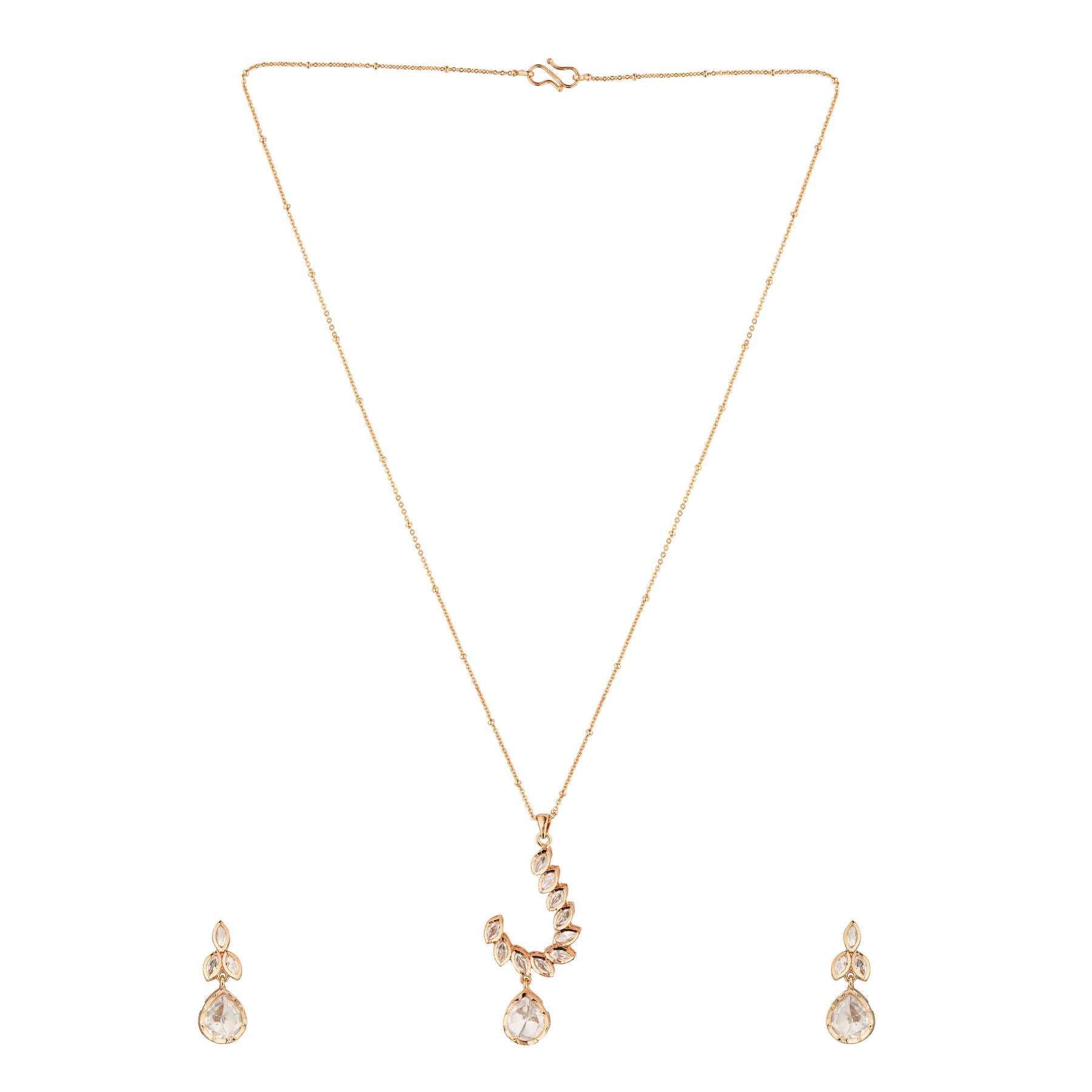 Jewellery Set: A graceful necklace set featuring marquise-cut AAA+ CZ stones arranged in a delicate leaf pattern, highlighted by a teardrop dangler at the center. Set in a refined gold-tone finish, the design is minimalist yet captivating. Paired with matching leaf-drop earrings, this lightweight set brings understated elegance to your ethnic and fusion ensembles.