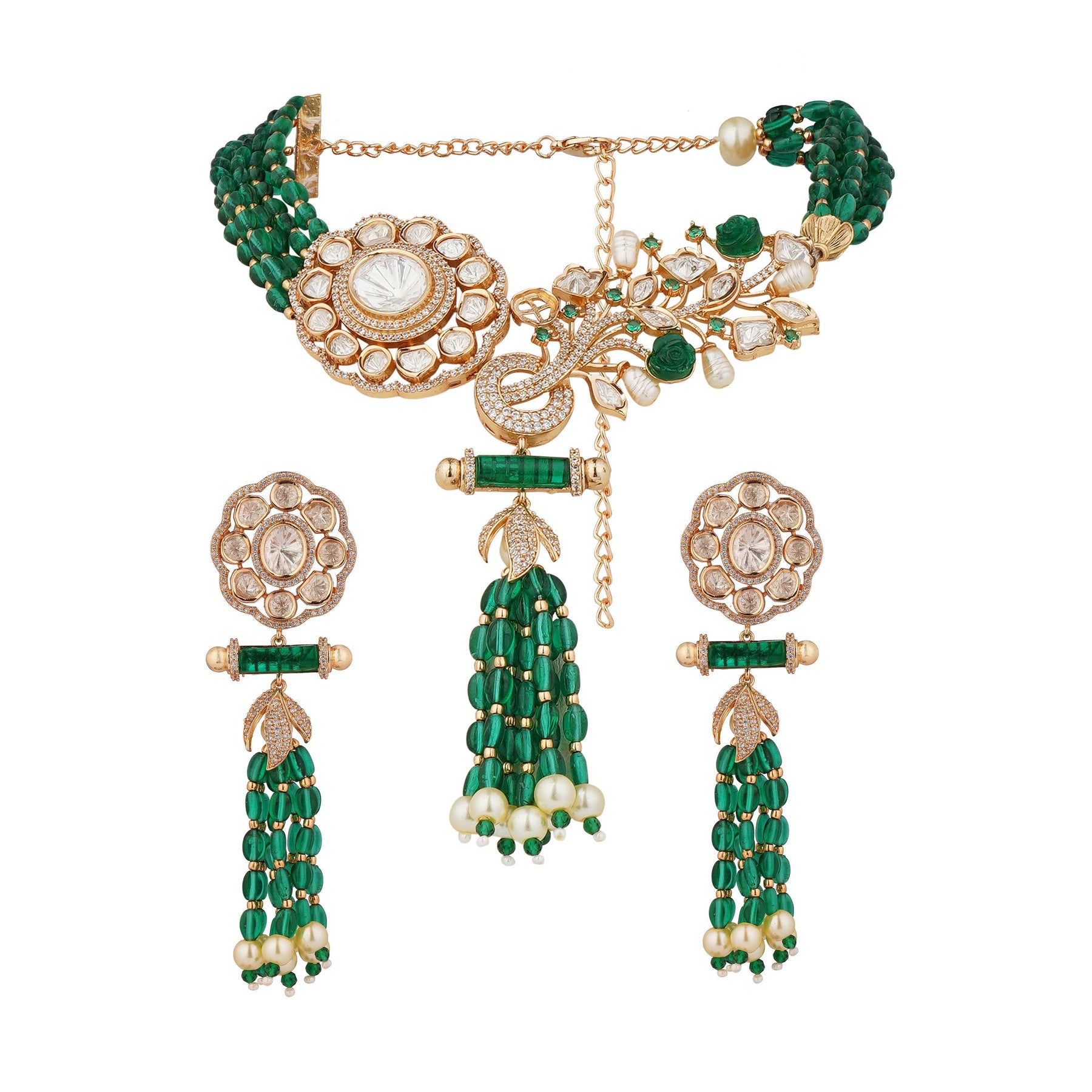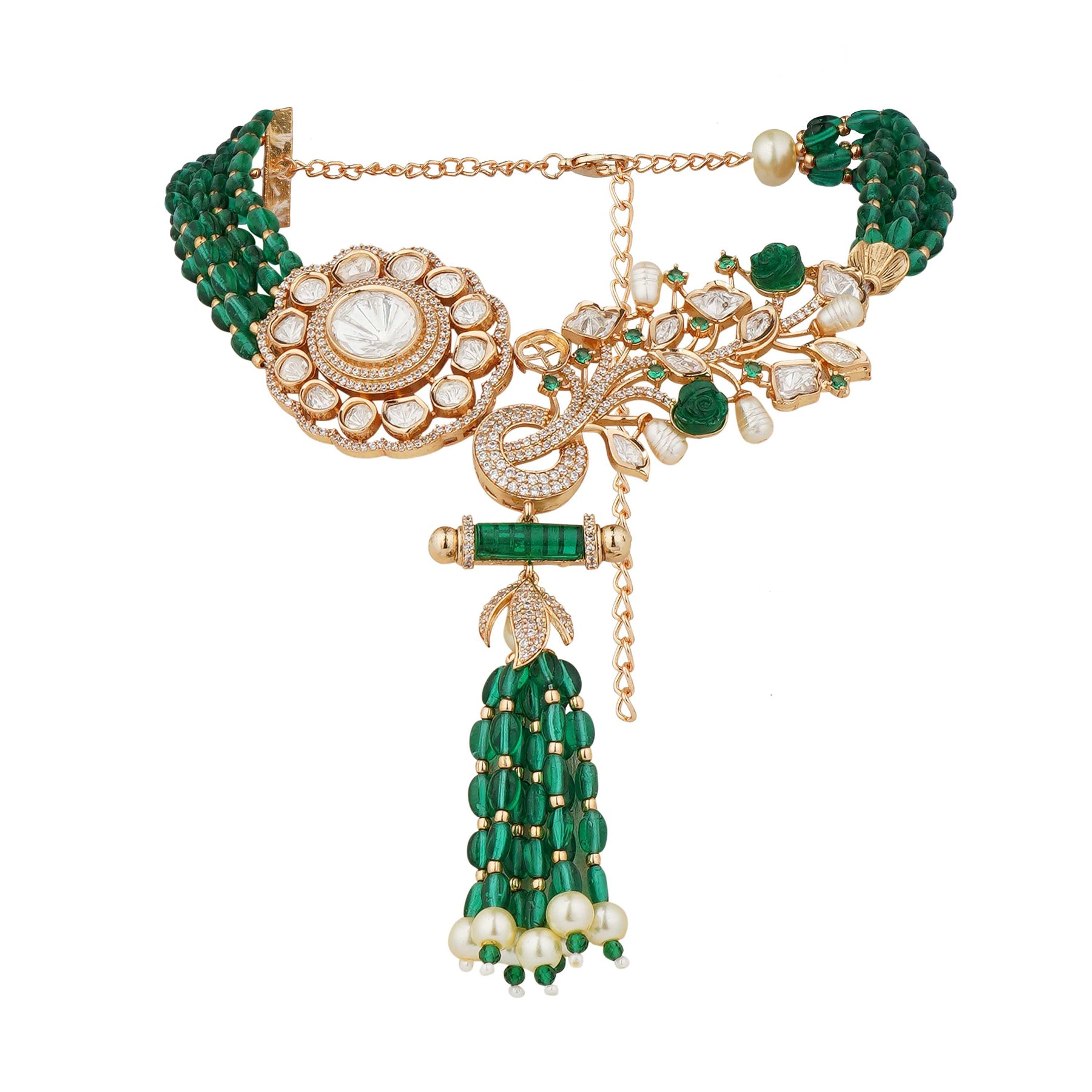 A stunning jewellery set designed with green beaded tassels, AAA+ CZ stones, and a rich gold finish. The floral motif and pearl touch make it unique and stylish, perfect for adding a royal charm to your look.